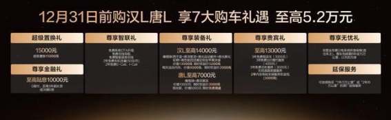 购车权益方面,比亚迪提供限时外观选装优惠。汉L原价1.3万元的外观套装,包括橄榄绿/西子蓝车色、悬浮黑顶、黑化运动套件、哑光黑化轮辋及性能四活塞定钳金甲黄涂装,限时仅需5000元;唐L橄榄绿/悬浮黑顶套装原价1万元,限时仅3000元;琉光银车色价值6000元,限时免费赠送。订购汉L或唐L可享受高达1.5万元的超级置换礼,所有权益截至12月31日,进一步提升了购车性价比。