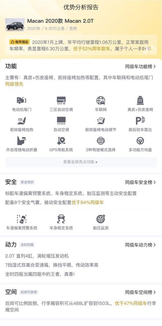 ,这辆2020款Macan 2.0T无论在外观、动力、配置还是用车成本方面,都展现出良好的综合实力。车辆外观设计辨识度高,融合跑车动感与SUV硬朗气质;动力充沛,满足日常和高速行驶需求;操控精准,带来纯正驾驶乐趣。尽管后排空间较为局促,油耗偏高,保养费用也不低,但其整体优势明显,尤其在安全配置和驾驶体验上超越大多数同级车。对于预算有限却想体验保时捷魅力的消费者而言,这辆二手Macan无疑是理想选择。