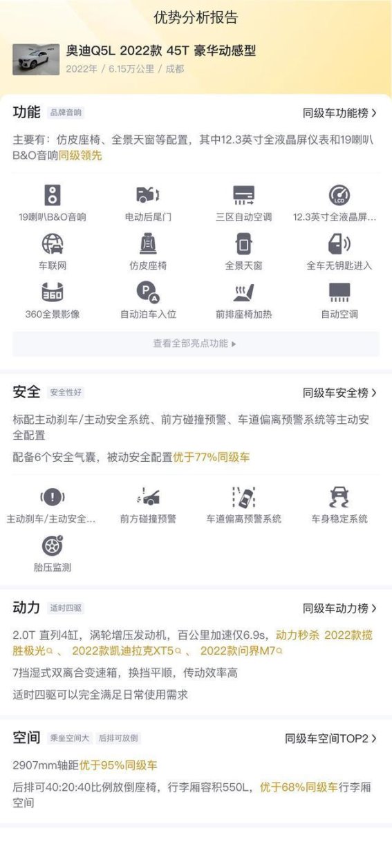 从市场行情和用车成本来看,根据大数据分析,这辆二手奥迪Q5L报价22.69万元,相较新车指导价45.02万元几乎腰斩,性价比极高。按照年均行驶2万公里计算,综合保险、保养、燃油等费用,每年用车成本约为20954元,在同级别豪华SUV中属于合理范围。对于希望以相对经济的价格体验奥迪豪华SUV的消费者来说,这无疑是一个极具吸引力的选择。