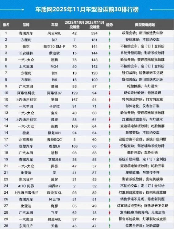 2025年11月,国内汽车投诉数量再度引发行业关注。根据车质网最新数据,本月共受理车主有效投诉17,961宗,其中包含来自第三方平台及后装轮胎的43宗投诉,环比上涨3.3%,同比增长高达33.6%。今年1至11月累计投诉量已突破20万宗,比去年同期上涨32.3%,创下历史新高。这一数据反映出,在新车型密集上市及汽车市场逐渐回暖的背景下,消费者对车辆质量和售后服务的关注度持续上升,也显示出车企在快速发展的同时面临越来越大的质量管理和服务压力。本月有效投诉涉及908款车型,其中投诉量达到两位数以上的车型有242款,车企针对投诉的回复共计18,179条,其中包括部分前期投诉的处理反馈。剔除车主因满意处理而主动撤诉的情况后,本月投诉量前30的车型显示,多数车型投诉环比出现上涨,方程豹旗下车型尤为突出,成为本月舆论焦点。
