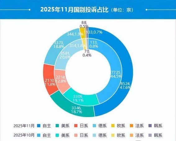 从品牌类型来看,自主品牌投诉量在11月出现反弹,环比上涨10.3%,占比提升3.1个百分点,投诉增长主要集中在服务问题,包括“定(订)金纠纷”和“不按约交车”。合资品牌投诉量和占比虽有所下降,但总体仍高于自主品牌。这说明自主品牌在售前和售后服务管理上仍存在改进空间,需要通过标准化流程和优化服务来降低投诉风险。从国别投诉占比看,美系、欧系及法系品牌投诉量均有不同程度增长,其中法系品牌环比上涨25.7%,欧系品牌环比上涨9.6%,占比略有提升,显示进口及合资品牌在国内市场同样面临质量及服务压力。