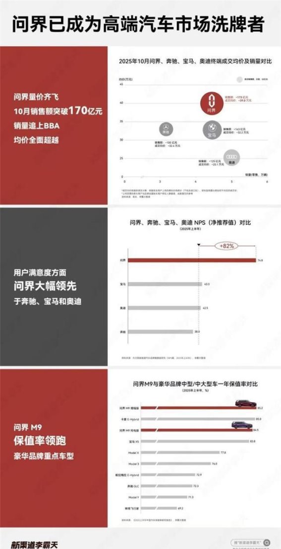 口碑是衡量产品力的另一关键指标。销量可以通过推广实现,但持续的好口碑必须依靠过硬的产品体验来支撑。权威机构杰兰路发布的《2024下半年-2025上半年新能源汽车品牌健康度研究》显示,问界M9连续两期获得新能源全车型用户净推荐值(NPS)第一,问界品牌整体NPS高达74.8,远超传统豪华品牌BBA。这意味着用户不仅愿意购买,更乐于向他人推荐,从而形成强大的口碑效应。这种信任与推荐效应,进一步增强了品牌的长期竞争力,也为问界M9的市场拓展提供了持续动力,使其在高端豪华SUV市场中建立起稳固的口碑壁垒。