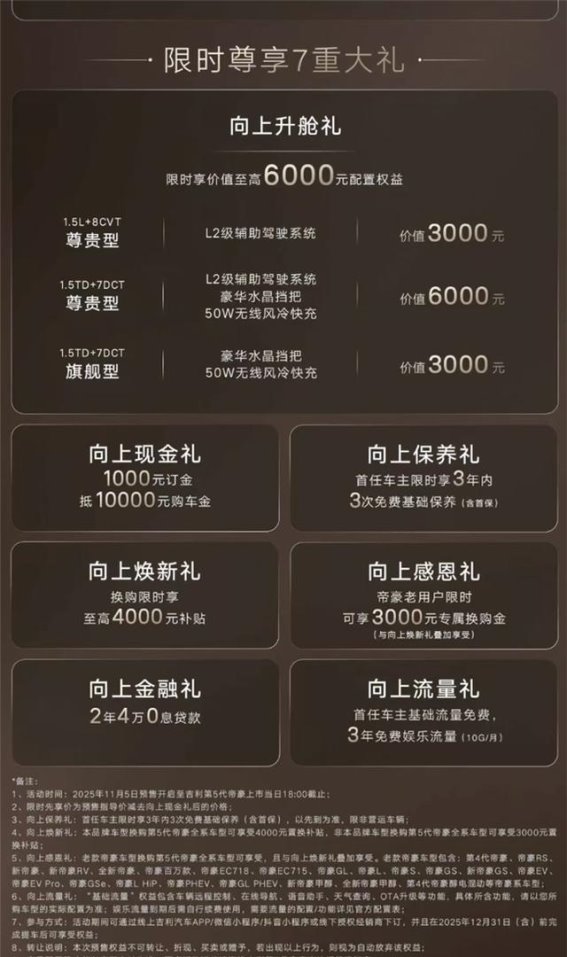 为了让更多家庭轻松拥抱全能出行,第5代帝豪在预售期推出了诸多超值权益,包括1000元抵10000元购车金、2年4万零利息金融礼以及L2级智能驾驶系统限时赠送。这些优惠不仅降低了购车门槛,也让家庭能够更轻松地享受到高品质出行体验。通过全方位升级与丰富情感价值,第5代帝豪正逐步成为新时代家庭家轿的新标杆,以其全能进化重新定义国民家轿的标准。