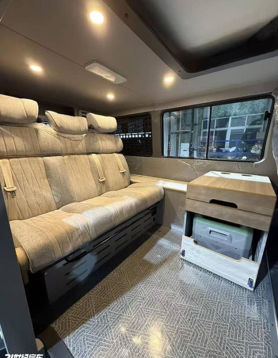 生活区的布局体现出“麻雀虽小,五脏俱全”的设计理念。尾部魔盒的设计既能扩展储物空间,又可延展餐厨区域,解决了短轴露营车储物不足的问题。车内配备可拉出收回的小桌板,下方嵌入 35L 冰箱,保障食材新鲜;后排三张人体工学座椅设计符合人体工程学,长时间乘坐不疲劳,放倒后可与后横床组合成约两米宽的休憩大床,足以容纳 2-3 人舒适睡眠。电动升顶帐篷一键操作即可升降,配合双层纱窗和四向全景窗,实现保温防蚊,又能 360 度欣赏自然风光,让露营生活更加贴近自然。