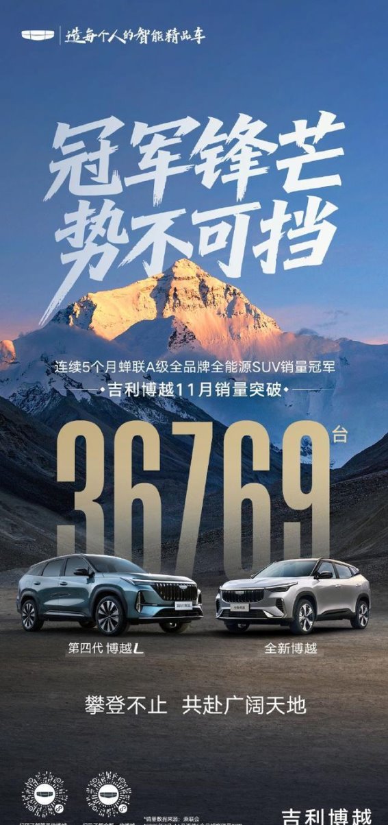 在竞争激烈的10万级燃油SUV市场中,第四代博越L凭借全方位升级的产品力,再次刷新了家庭用车的价值标准。从设计美学到智能座舱,从动力系统到安全防护,这款车通过实打实的技术升级,为家庭用户提供了兼具实用性与科技感的选择。数据显示,吉利博越系列在11月热销36769辆,已经连续五个月蝉联A级全品牌全能源SUV销量冠军,这不仅说明市场对博越的认可,也显示出消费者对于家庭出行车辆在空间、智能和安全等方面的高标准需求。第四代博越L正是通过全链条的优化升级,满足了家庭用户对舒适、便捷与安全的综合要求。
