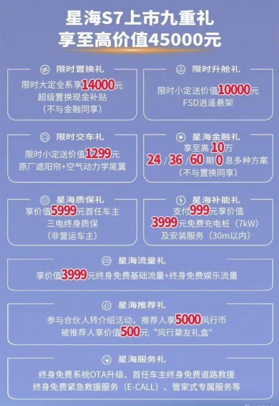 接下来,我们来看看另一款颇具竞争力的车型——星海S7。星海S7是一款中大型SUV,提供了纯电版和增程版两种动力选择。消费者购买星海S7时,将能够享受到高达45000元的九重豪华礼遇。这一优惠不仅涵盖了车辆本身的价格,还包括了一系列增值服务和赠品,大大提升了购车的性价比。