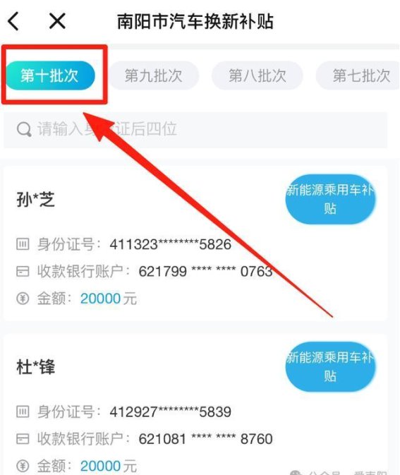 用户需要在爱南阳APP上完成注册并进行实名认证。注册完成后,打开APP首页,在搜索框内输入“汽车补贴”,点击进入相关页面。进入页面后,用户需要选择“汽车报废换新补贴”栏目,并向下滑动页面,找到“点击查看补贴资金发放情况”的按钮。点击该按钮后,用户即可查看到南阳市第十批汽车报废更新补贴的拟发放名单。