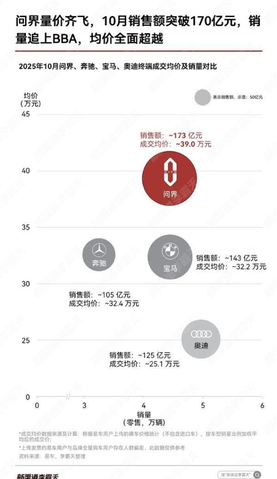 2023年10月,问界品牌在中国汽车市场交出了一份令人瞩目的成绩单,成功实现了销量与均价双双突破,首次与传统豪华车品牌BBA(奔驰、宝马、奥迪)平起平坐。根据最新统计数据,10月,问界的交付量达到了4.4万辆,单月销售额高达173亿元人民币,且其平均成交价达到了39万元。通过这组数据,问界在30-60万元价位区间的豪华SUV市场占据了重要地位,成功锁定了消费者的购买偏好,展现出强大的市场竞争力。