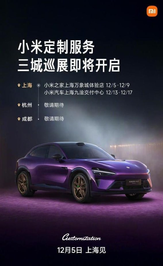 12月4日,小米汽车宣布,将于上海、杭州、成都三座城市启动定制服务的巡展,第一站将于12月5日在上海万象城的小米之家体验店举行。此次巡展不仅为消费者带来了新鲜的体验机会,也标志着小米在汽车领域个性化定制服务的全面启航。