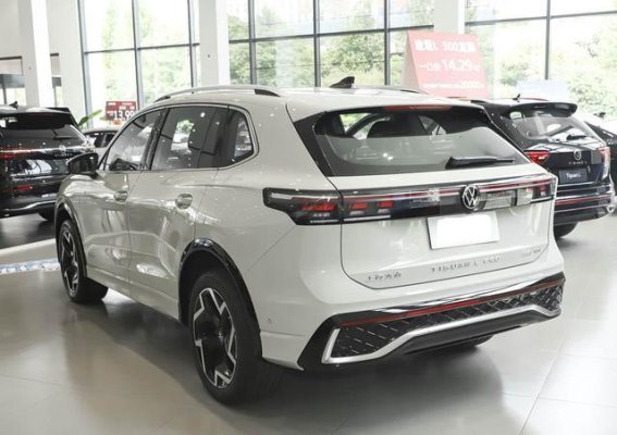 车尾部分的设计同样值得称道。2026款途观L Pro领航版的尾部采用了贯穿式LED灯带和发光Logo的组合,与前脸的设计相呼应,增强了整车的辨识度。R-Line版本的黑色扩散器与双边四出排气装饰,虽然实际排气为隐藏式设计,但通过细节设计仍然突出了运动感。尾灯组采用了3D立体结构,点亮后呈现出的效果显得非常现代且富有层次感,夜间的可视性大大提升。后保险杠的银色护板不仅能够有效保护车身,还通过几何切割线条的设计,进一步增强了尾部的立体感和视觉层次。