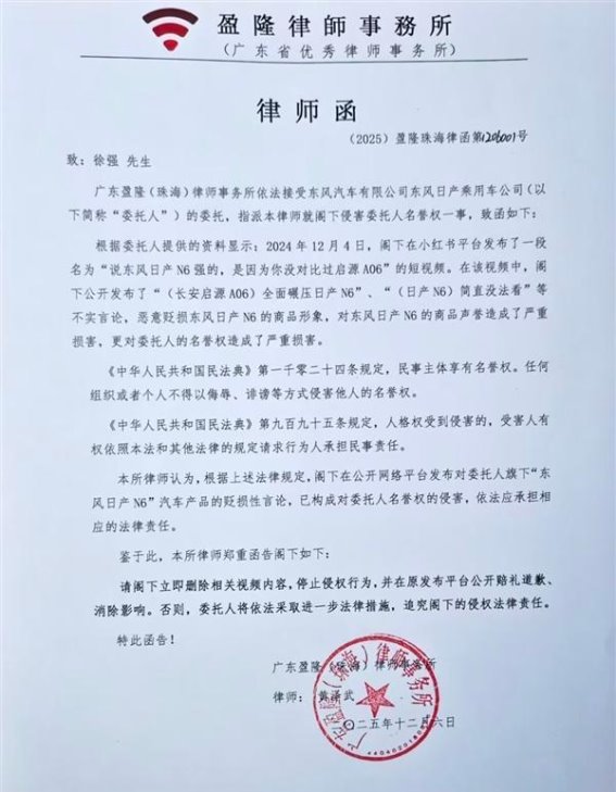 近年来,随着自媒体平台的迅速发展,网络言论的影响力日益增强。尤其是在汽车行业,品牌之间的竞争不仅限于产品质量和市场销售,网络平台的言论也成为了品牌形象的重要组成部分。随之而来的问题也让企业面临巨大的挑战。东风日产近日便因旗下N6车型遭遇恶意抹黑和不实对比,迅速采取了法律手段,向网络平台上的相关用户发出了律师函,要求其为不实言论公开道歉,消除影响。