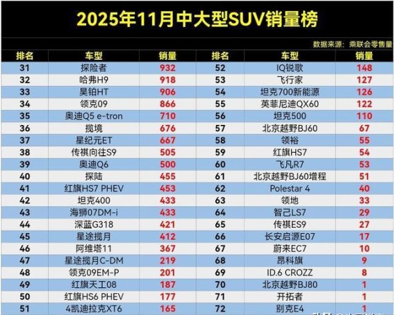 ,2025年11月的中大型SUV销量榜单,展现了一个更加多元化且竞争激烈的市场环境。新能源车的崛起,正在重新定义中大型SUV市场的格局。随着小米YU7、钛7、银河M9等车型的强势表现,新能源车型无疑将成为未来市场的主导力量,而传统燃油车则需面对更加激烈的市场竞争。
