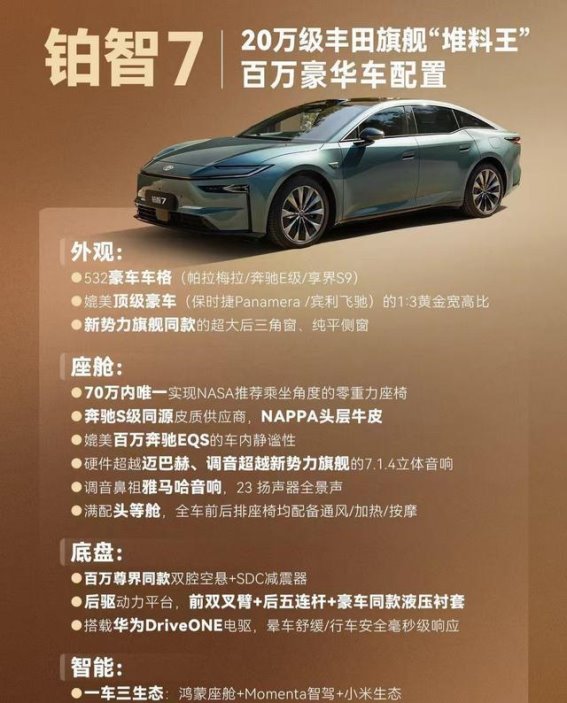铂智7即将在20-25万元区间上市,面临极氪007、小米SU7、小鹏P7i和特斯拉Model 3等强劲对手。它的优势在于融合了传统车企的制造品质与售后网络、新势力级别的智能化体验,以及具有竞争力的定价和权益政策。特别是“跨年购置税补贴”的政策加持,让计划购车的用户更加安心,也体现了广汽丰田对市场机会的精准把握。
