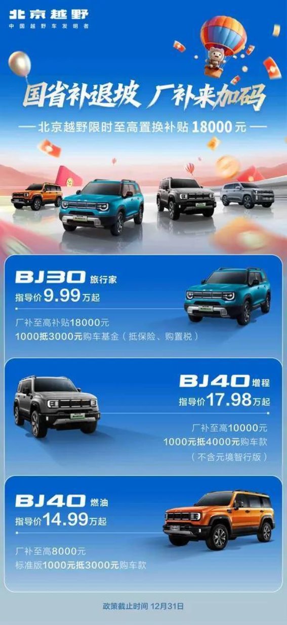 总的来看,北京越野BJ30旅行家在2025年的限时厂补政策下,不仅提供了实实在在的购车优惠,更凭借出色的空间设计、轻越野性能及贴心用户服务,成为轻越野SUV市场的新标杆。无论是追求旅行自由的个人,还是家庭用户,BJ30旅行家都能提供舒适、可靠与经济兼备的出行体验,让每一次旅程都成为值得回忆的旅行。通过这款车,北京越野将越野精神与生活方式紧密结合,让用户在轻越野旅行中享受自在与惬意,也让每一次出行都充满信心与期待。