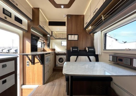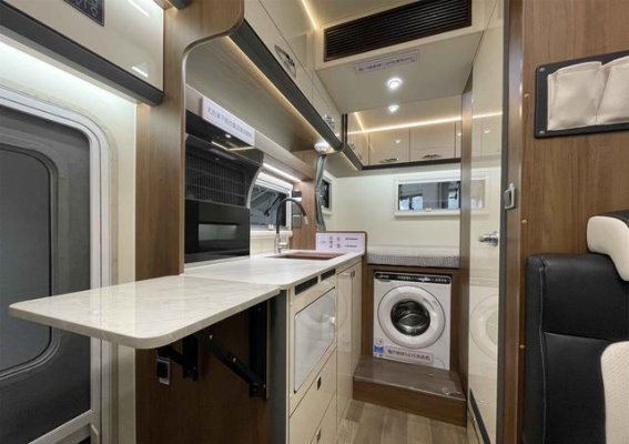 厨房区配置完善,定制岩板台下盆搭配折叠延长板,操作灵活便捷。大功率吸油烟机与电动止逆阀有效解决烹饪油烟问题,确保车内空气清新。嵌入式230L双开门变频风冷冰箱提供充足储物空间,箭牌不锈钢大单槽与科勒万向水龙头提升了清洗便利性。厨房还配备5KG滚筒洗衣机、一氧化碳/烟雾报警器及20L小米平板微波炉,使烹饪与洗衣变得轻松,满足旅途生活的各种需求。