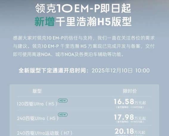 领克10 EM-P的新款车型主要面向中低配版本进行调整,指导价为17.58万元与18.98万元,限时优惠价分别为16.58万元和17.98万元。此次调整主要体现在智驾配置上,将千里浩瀚H7方案调整为H5方案,同时算力从英伟达AGX Thor的700TOPS降为Orin Y的200TOPS,并减少了两个毫米波雷达,虽然智驾性能略有下降,但基本功能不受影响。用户若愿意支付额外1万元,可升级回H7方案。外观方面,新车取消了运动风格套件和电动扰流板,内饰材质改为真皮,未配备车载冰箱。动力方面,搭载1.5T发动机与电机组合,零百加速分别为5.1秒和5.9秒,CLTC纯电续航为120km和240km,整体更偏向日常使用和性价比考量的消费者。