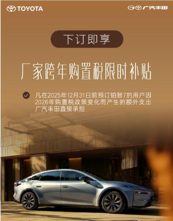 除了出色的驾驶体验,铂智7在购车成本上的优势也十分明显。面对2026年1月1日起新能源购置税调整为“减半征收”的政策,广汽丰田推出了跨年购车补贴计划。只要在今年12月31日前完成预订,明年交车时产生的额外税费全部由厂家承担。对消费者而言,这意味着在享受政策优惠的还能节省可观的购置成本。无论是首次购车还是置换升级,这样的购车时机都极具吸引力,让铂智7在20万级智能纯电市场中具备显著的性价比优势。