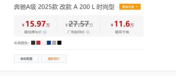 近期,豪华车市场掀起了一股前所未有的价格风暴,奔驰A级成为了舆论和消费者关注的焦点。2025款奔驰A级A 180 L,原本指导价为25.13万元,如今在叠加终端优惠和区域补贴后,裸车价低至15.97万元起,最高让利幅度超过11万元。这一举措打破了入门豪华车的价格壁垒,也让不少老车主感叹“买早了”。15万就能开上奔驰,不再只是梦想,而是切实可行的现实。业内人士分析,这波调价不仅是奔驰针对年轻消费群体的战略布局,也反映了品牌在竞争激烈的豪华入门市场中主动求变、提升性价比的决心。