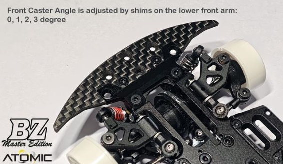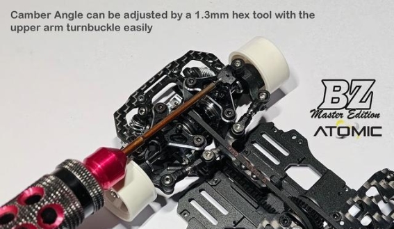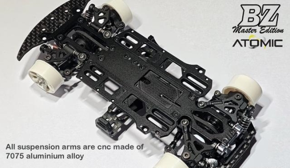 悬挂系统的升级也是BZ Master Edition的重要改进之一,采用了CNC加工球头式悬挂设计,有效减少高速行驶时的晃动和虚位,提升整车操控精度。悬挂的外倾角可通过上摆臂拉杆螺丝快速调节,使车辆在不同赛道条件下能够实现最佳抓地力与转向响应的平衡。全悬挂臂采用7075铝合金制造,在高速和超高速赛道中提供出色的刚性和稳定性,确保连续激烈操作下悬挂系统依然保持一致性。这种设计不仅增强了车辆在赛道上的表现力,也为车手提供了更多可调节的操作空间,使车辆操控更加灵活与精准。