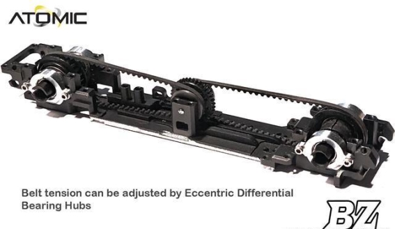 BZ Master Edition的一大亮点是全新一体式主车架设计,将前后差速壳、主齿座、马达座及底盘板进行了整体整合,并采用7075铝合金一体加工制造。这种一体化设计不仅大幅提升了车架的整体刚性,还确保了传动系统各部件的精确对准,减少了动力传递中的能量损耗和微小偏差。无论是急加速还是高速过弯,车手都能感受到线性且稳定的操控反馈,这种精密的加工工艺体现了RC Atomic在材料选择和制造工艺上的严谨与专业,也让车辆在竞赛中具备了更高的稳定性和可靠性。