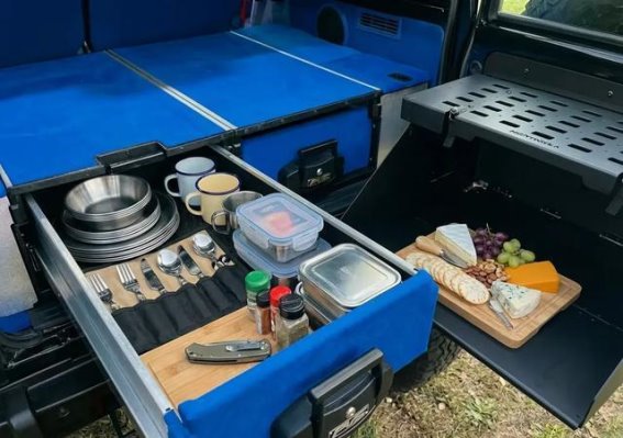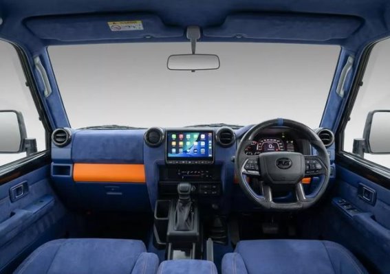 内饰改装则更为彻底,打破传统硬派越野车单调风格,座舱采用深蓝色Alcantara面料,搭配橙色缝线和装饰板,呈现出一种概念车般的未来感,仿佛从动画世界走出来一般。科技配置方面,9英寸信息娱乐显示屏让操作更便捷,后备箱新增抽屉和尾门小桌板,则为露营和户外活动提供了极大便利。座椅升级为Recaro Cross Sportster GK100桶形座椅,多功能方向盘借用丰田坦途皮卡设计,并用碳纤维饰板包覆,使操控感和视觉质感兼具。这种内饰改装不仅提升乘坐舒适性,也让车辆在豪华感和科技感上达到全新高度。
