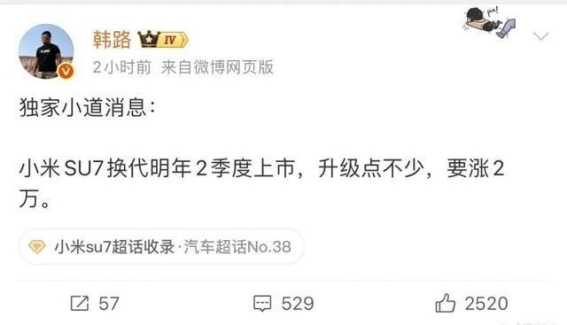 小米SU7自2024年上市以来,一直以强劲的产品力和高性价比受到市场关注。现款SU7于2024年3月底正式发布,推出三款车型,售价区间21.59万元至29.99万元。首批车型上市仅四分钟订单突破一万,27分钟订单超过五万,24小时订单量达到88,898台,一度刷新国内新车发布的订单纪录。此后,小米YU7上市打破了这一纪录,仅三分钟大定突破20万台。现款SU7凭借亮眼的销量和市场表现,成为中大型电动车市场的热门车型,但随着市场竞争加剧及YU7的冲击,SU7的销量出现下滑。根据资深车评人韩路爆料,小米SU7的新款车型预计将在2026年第二季度正式上市,价格或上调2万元,同时带来多项配置升级,意在提振市场信心和销量表现。