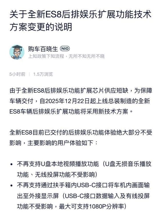 根据蔚来官方发布的信息,由于芯片供应链出现问题,全新ES8的后排娱乐功能扩展方案将在2025年12月22日起进行调整。具体来说,这一调整将导致车主无法使用U盘进行本地视频播放。尽管如此,其他功能如U盘无损音乐播放和无线投屏仍不受影响。更为重要的是,通过扶手箱内USB-C接口输出车机画面至外接显示屏的功能也将被取消,虽然USB-C接口的基本数据输入及有线投屏功能依然保留,且最大支持1080P分辨率。
