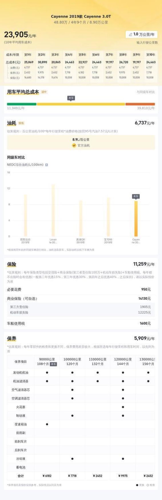 从用车成本的角度来看,Cayenne的百公里油耗为8.9升。按照每年行驶2万公里计算,年油费大约为14208元。而每年保险费用大约为13758元,保养费用则为5938元。尽管这些费用在豪华SUV中并不算低,但综合考虑到该车的品牌价值和性能表现,这些成本在可接受范围之内。