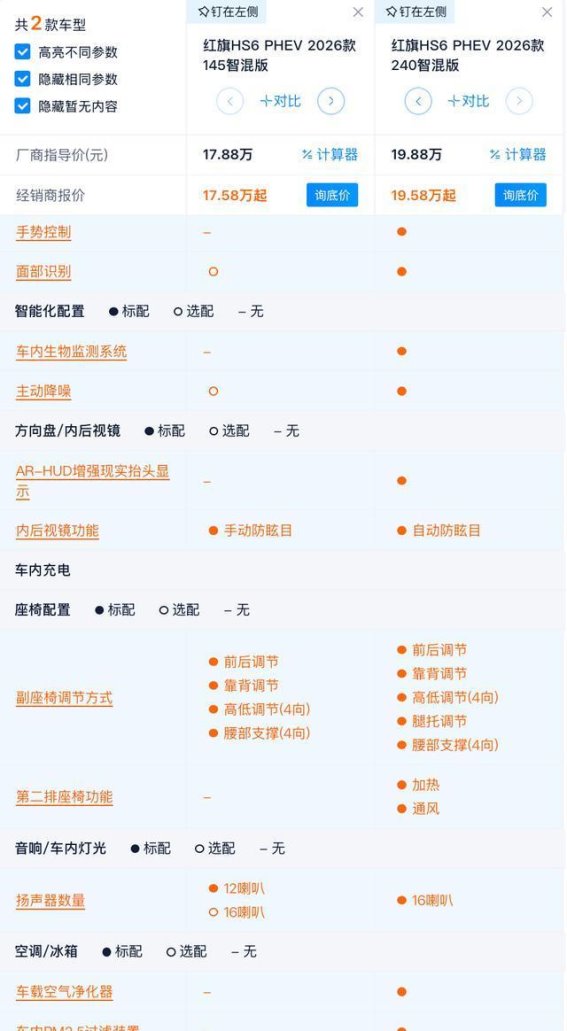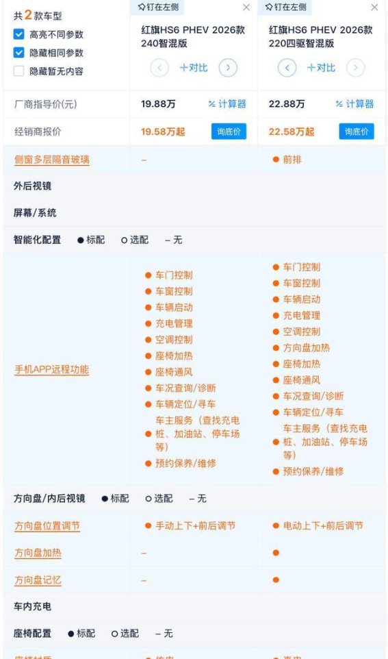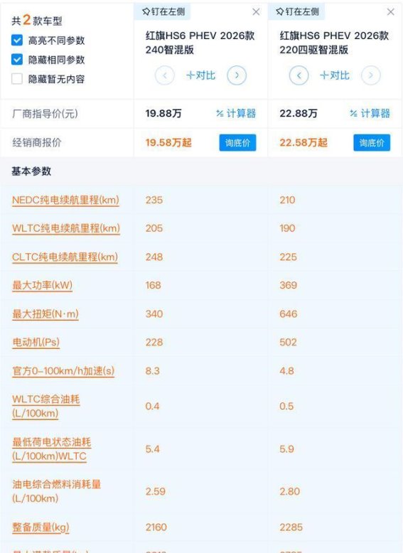 红旗HS6 PHEV作为一款全新旗舰SUV,在性能、配置和价格方面做出了精心的设计。无论是240智混版还是220四驱智混版,都提供了不同层次的选择,满足了不同消费者的需求。,240智混版凭借其更高的性价比成为了更为推荐的选择,而220四驱智混版则适合那些追求极致动力和操控性能的消费者。红旗HS6 PHEV无论是从产品力还是性价比上,都值得消费者深思熟虑。