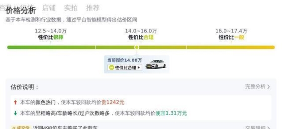 该车的新车指导价为30.78万元,而如今的二手车报价为14.88万元。通过对比可以看出,二手车价格相比新车便宜了近一半,这无疑提升了其在市场上的竞争力。在评估车辆时,我们需要结合车况、车龄、里程等多重因素,综合考虑其实际价值。虽然行驶里程略高,但其性价比依然非常突出。