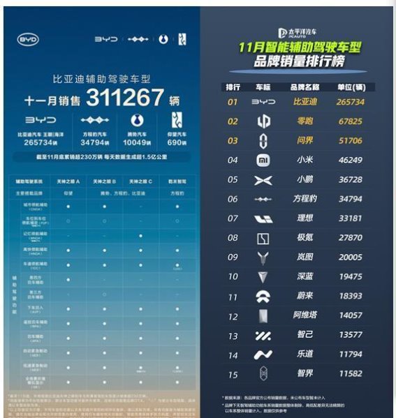 比亚迪近期发布了搭载其“天神之眼”辅助驾驶系统的车型销售数据,显示出这一技术在市场中的强大表现。2025年11月,搭载该系统的车型月销突破31万辆,持续领跑市场,充分展示了比亚迪在智能驾驶领域的领先地位。特别是王朝系列与海洋系列车型的销售表现,贡献了超过26万辆的销量,彰显了比亚迪品牌的强大吸引力。与此方程豹、腾势以及仰望等高端品牌的稳健表现,也为比亚迪在智能驾驶领域的广泛布局提供了有力支持。