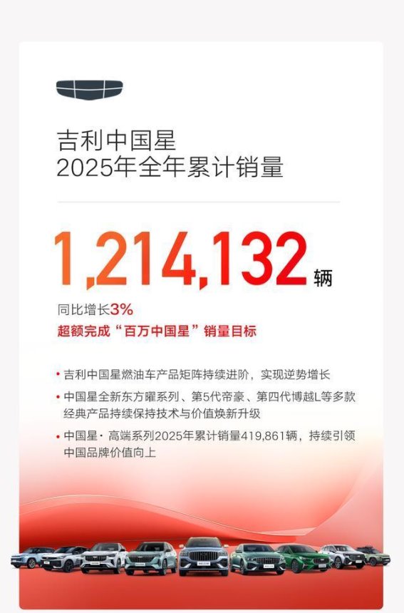 展望2026年,吉利已设定345万辆的销量目标,其中新能源预计销售222万辆,并计划推出10款全新车型。随着银河V900等新车上市,全域AI技术进一步普及,加之全球化布局的持续深化,吉利的增长势头有望延续。从燃油车到新能源,从平民化到高端车型,从国内市场到海外市场,吉利已经构建了全方位竞争优势。2025年的302万销量,不仅是数字的突破,更代表了吉利在产品、技术、全球化战略和企业责任上的全面发力。吉利将在更高的目标下书写属于自己的全球汽车新篇章。