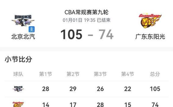 北京时间1月1日,CBA常规赛迎来一场备受瞩目的焦点对决:北汽男篮对阵广东男篮。赛前,北汽以七胜一负的战绩稍占优势,而广东正处于八连胜的高光期,球迷们甚至开始畅想广东能连续拿下十连胜。比赛的结果却完全超出预期,广东男篮以74比105惨败,八连胜被终结,这场比赛不仅让广东球迷错愕,也让联盟对两队的整体实力有了重新认知。赛前的“势均力敌”被开局就打破,北汽从一开始就展现出了强烈的胜利欲望和比赛掌控力。