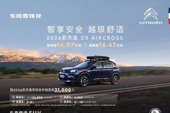 为了回馈消费者,东风雪铁龙为2026款天逸C5 AIRCROSS推出了一系列优惠政策。包括高达31,000元的综合购车补贴,26,000元的现金优惠,5,000元的增换购补贴以及2年0息金融政策。车主还可享受5年或15万公里的整车质保。通过这一系列的优惠措施,东风雪铁龙进一步降低了购车门槛,为更多消费者提供了更具吸引力的购车选择。