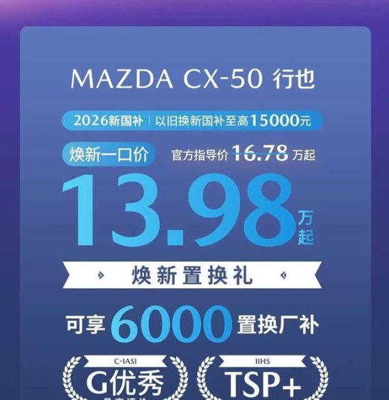 上周末我和几位老同学聚在一起,聊起了换车的话题。大家的预算都差不多在十五六万之间,自然想买一台合资SUV,既能满足日常通勤,又能偶尔带着家人或者朋友去自驾游。讨论过程中,三条截然不同的道路显现出来:一个人选择了丰田RAV4,因为它省心、省油、口碑稳定,是老牌合资SUV的代表;另一个人看重空间和灵活性,最终锁定本田CR-V,尤其是后排乘坐舒适感和储物空间让他心动。最后一个人,就是我今天要讲的主角——他自称“周末野人”,热衷自驾旅行,对车辆的驾驶质感和操控体验有着近乎固执的追求,他选择了马自达CX-50行也,并且兴奋地告诉大家:“一口价13.98万,捡了个宝。”这个选择在许多人看来有些出乎意料,但实际上,这台车确实有让人心动的理由。