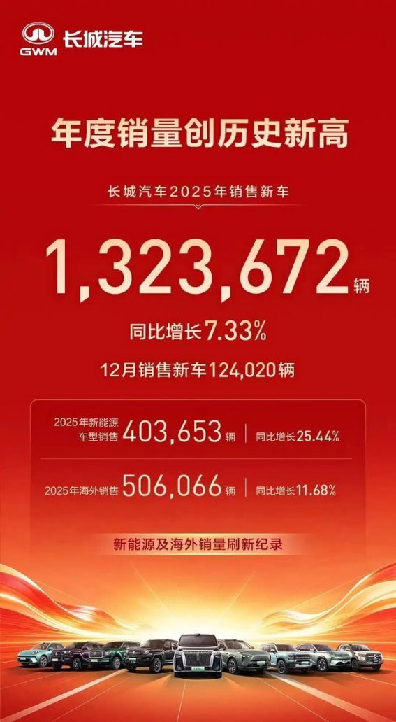 2025年1月2日,长城汽车正式发布了其2025年全年的销量数据,2025年总销量达到1323672辆,同比增长7.33%,创下历史新高。特别是在新能源与海外市场两个领域,长城表现尤为亮眼,分别实现了显著的增长。这份成绩单不仅体现了长城汽车的实力,更为未来发展奠定了坚实的基础。