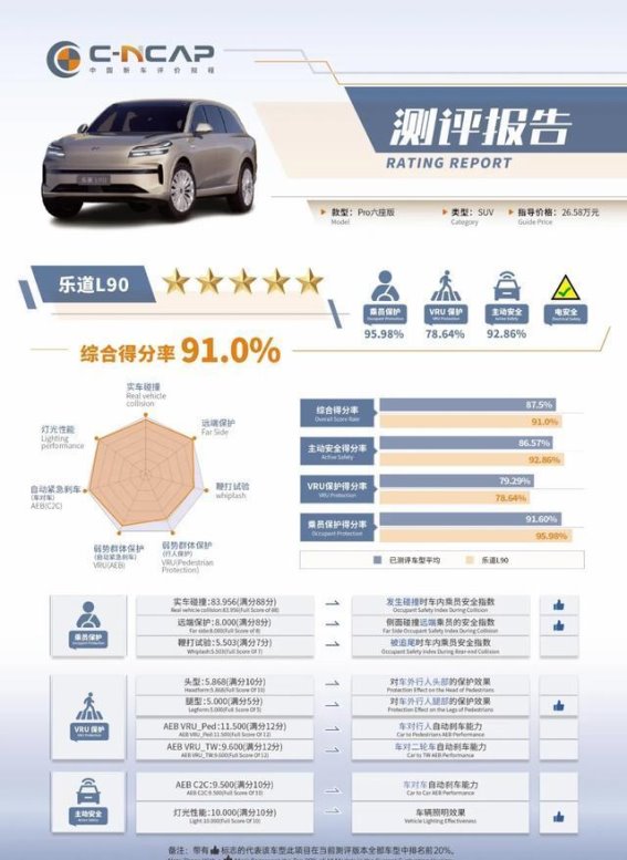 安全性是家用车最为重要的考虑因素之一,尤其是对于大三排SUV来说,如何保证每一位乘客的安全更是重中之重。乐道L90凭借其卓越的安全设计,成为了大三排SUV中唯一一款获得C-NCAP安全和C-GCAP健康能效双五星认证的车型。尤其是在侧气帘的设计上,乐道L90的宽度比行业平均水平高出10cm,这一设计不仅能够更好地保护成人乘客的头部,还能够在关键时刻为儿童提供更加全面的保护。对于带孩子出行的家庭来说,这一设计无疑是最贴心的安全保障。