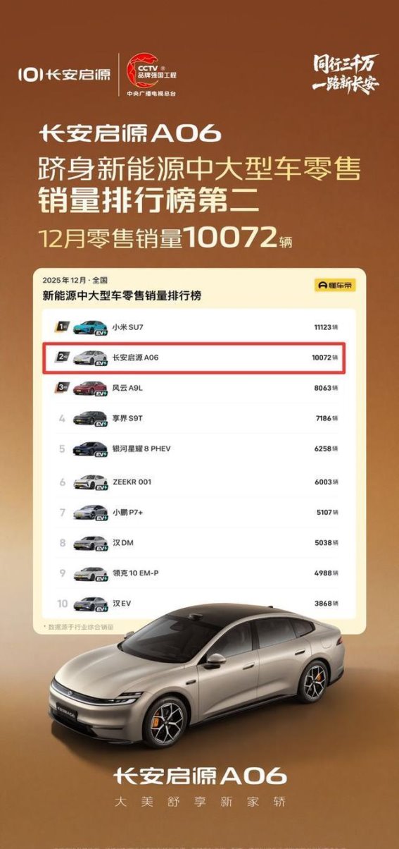 在竞争激烈的新能源市场中,长安启源A06凭借其卓越的技术和不凡的市场表现,迅速跻身新能源中大型车零售销量排行榜的第二位。2023年12月,A06的零售销量高达10072辆,成为了这一细分市场中的耀眼新星。随着其在智能技术和车内设计上的不断创新,A06的销量持续攀升,展现出了强大的市场竞争力和消费认可度。