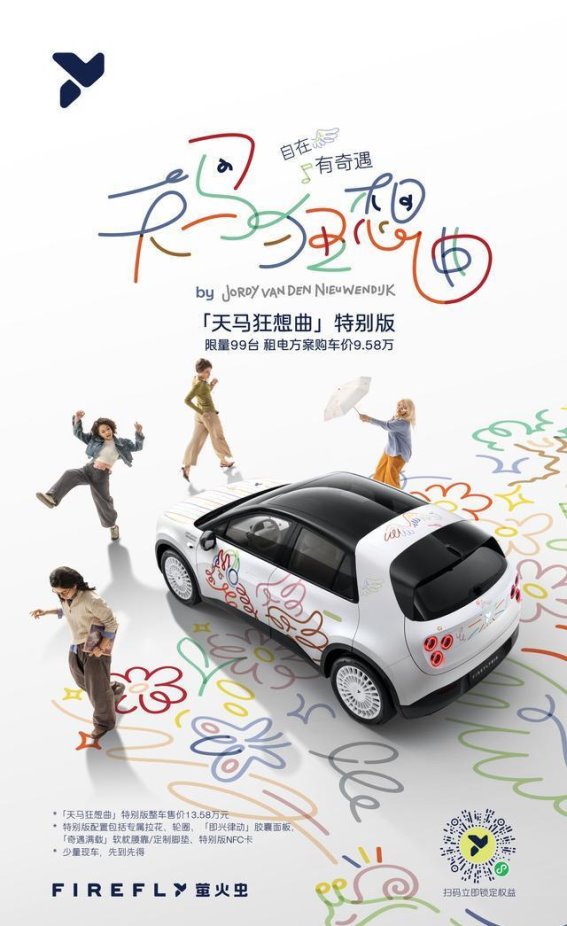 2026年1月15日,蔚来旗下的Firefly萤火虫品牌正式发布了与荷兰当代艺术家Jordy van den Nieuwendijk携手打造的「天马狂想曲」特别版车型。这款限量发售99台的特别版车型以其独特的设计和前卫的理念,成为市场上的新宠,引起了极大的关注和讨论。