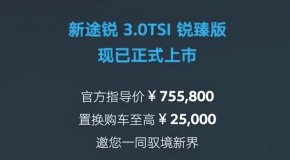 1月23日,大众汽车正式推出了途锐3.0TSI锐臻版,官方指导价为75.58万元,同时提供最高2.5万元的置换补贴。这款新车型的亮相,为消费者带来了更加动感与豪华并存的选择。途锐3.0TSI锐臻版不仅搭载了强劲的3.0TSI V6发动机,而且在外观和内饰方面都进行了全面升级,尤其是全黑化的R-Line运动外观套件,成为其最大亮点之一。
