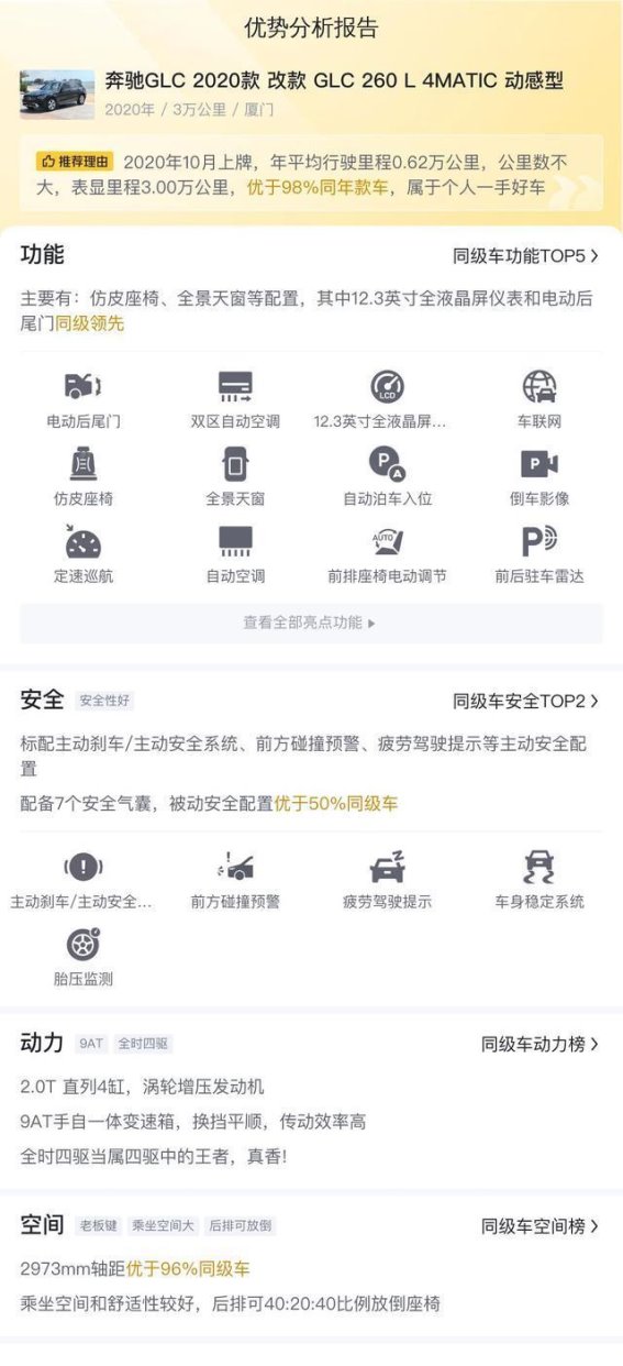 这款车的售价为21.98万元,与新车指导价39.48万元相比,足足便宜了17.5万元。对于喜欢奔驰品牌的消费者而言,二手奔驰GLC提供了一个非常具吸引力的选择。通过这笔投资,你不仅能够享受奔驰的豪华品质,还能够节省相当可观的费用。
