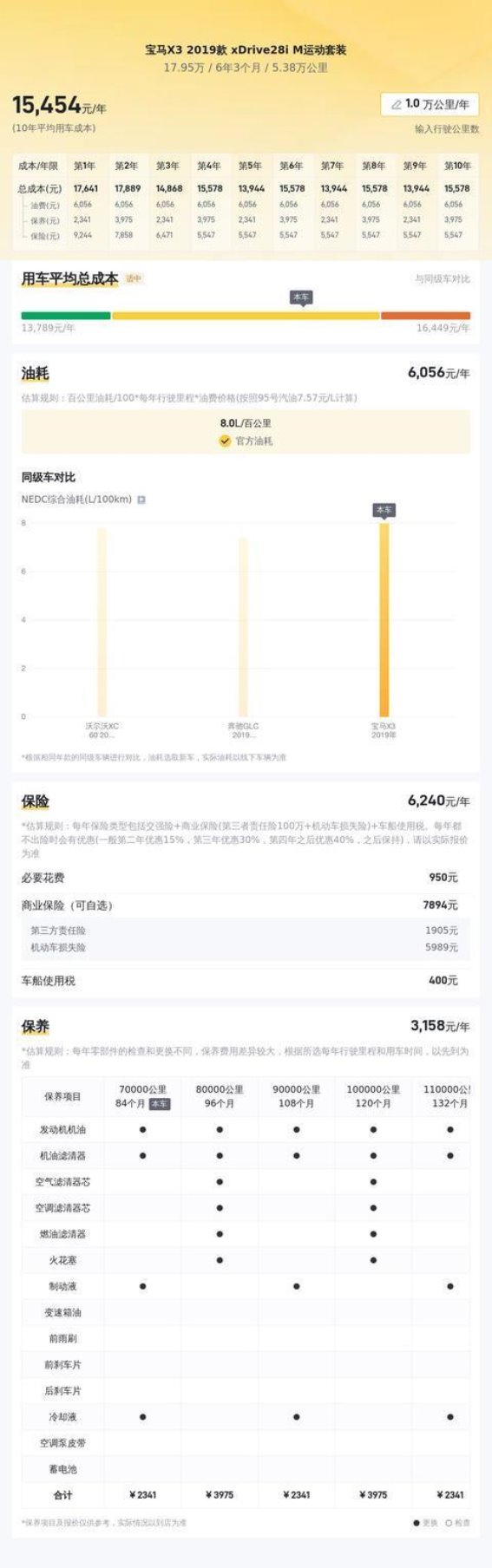 不过,需要注意的是,宝马X3的用车成本较高。据估算,宝马X3 2019款 xDrive28i M运动套装的年均用车成本大约为14765元,相较于同级车的最低用车成本6509元要高出不少。日常用车时需要考虑油耗、保养和维修的费用。特别是在燃油消耗方面,该车的百公里油耗为8.0L,虽然不算过高,但相较于部分同类车型仍然偏高。如果长时间的日常驾驶较为频繁,可能会带来较大的燃油开销。
