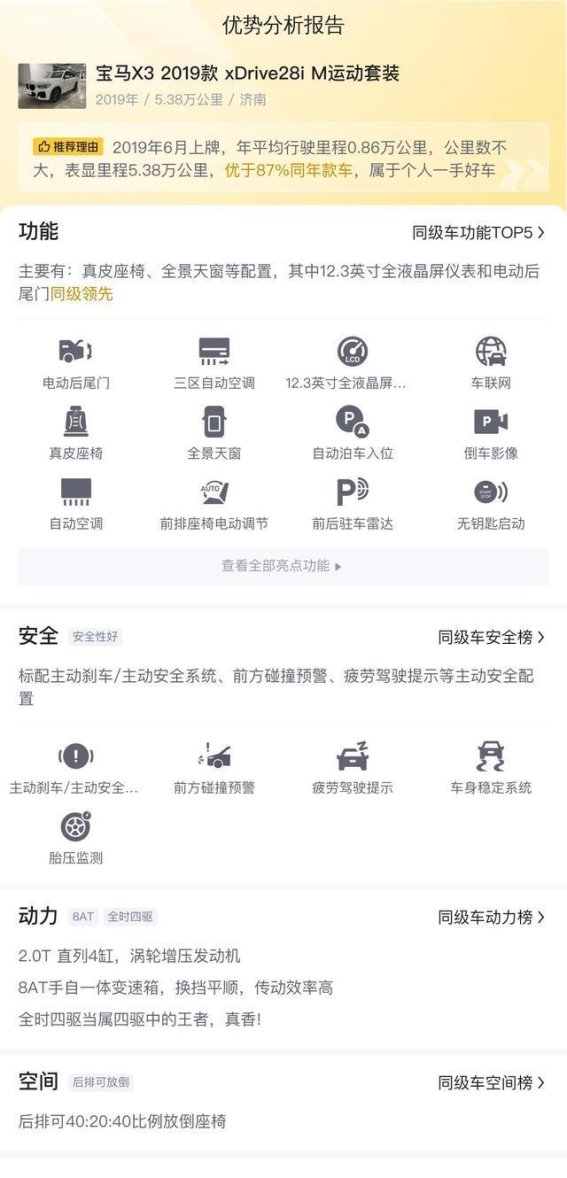 总体来看,宝马X3 2019款 xDrive28i M运动套装是一款在动力、操控、舒适性和豪华配置方面表现均衡的中型SUV。它适合那些追求驾驶乐趣、注重车辆豪华感和操控性能的消费者。如果你对后排空间没有过高要求,并且能够接受相对较高的用车成本,宝马X3无疑是一款值得推荐的二手车选择。