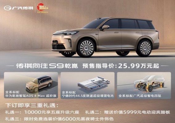 为了进一步提升消费者的购车体验,广汽传祺还为向往S9的预售推出了三重礼遇。消费者在购车时可以享受10000元的优惠,将五座版车型升级为六座版,增加了车内空间,特别适合家庭用户。购车者将获得价值5999元的电动迎宾踏板,为每一次上车都增添一份豪华感和便利性。在限时期间,消费者还可以免费选择价值6000元的黑夜骑士外饰色,为向往S9增添一份独特的个性魅力。