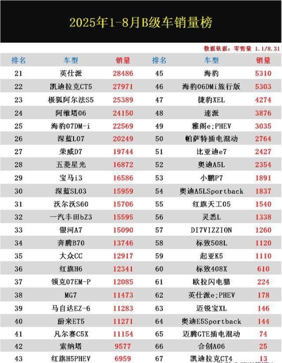 近年来,B级车市场正经历一场前所未有的变革。以比亚迪为代表的新能源车型,凭借着强大的技术创新和市场布局,逐渐取代了传统燃油车的位置,成为市场的主力军。与之形成鲜明对比的是,传统燃油车品牌尽管依然占有一定市场份额,但面临的压力和挑战前所未有。根据2025年1至8月的B级车零售量数据,新能源车型的崛起已经打破了以往燃油车主导的格局,传统合资品牌的优势正在被逐步蚕食,市场竞争的规则发生了根本性变化。