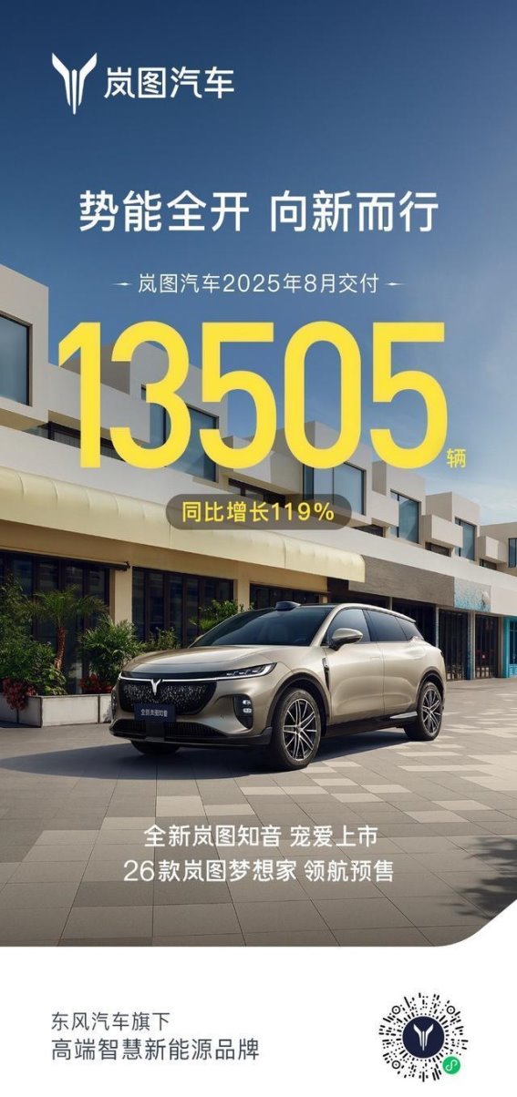 岚图汽车的市场表现亦令人瞩目。2024年,岚图汽车计划交付85697辆,同比增长约70%。而2025年1至8月,岚图汽车的交付量已经达到81768辆,同比增长幅度高达92%。其中,2025年8月单月交付量为13505辆,同比增长119%,并成功实现七连涨,刷新了历史纪录,显示出其强劲的增长势头。