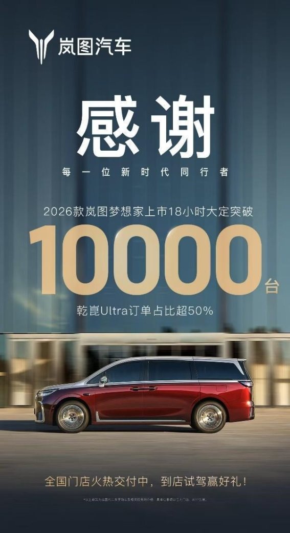 岚图梦想家作为高端MPV市场的明星车型,持续表现强劲。自上市以来,岚图梦想家已连续三个月蝉联新能源MPV月度销冠,并且累计交付量突破13万辆,单车均价达到39万元,成为高净值人群的首选车型。2023年9月15日,岚图梦想家2026款焕新上市,推出了鲲鹏与乾崑两大智能系列,涵盖PHEV和EV双动力模式,售价区间为32.99万元至43.99万元。这款车型不仅搭载全球首款800V智能超混系统,还配备了华为ADS 4.0、鸿蒙座舱5.0及智能后轮转向等顶级配置。上市后仅18小时,岚图梦想家焕新版的订单量便突破10000辆,市场反响异常热烈。