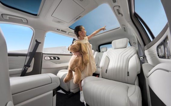 从外观和尺寸来看,银河M9的设计可以说是大气与实用兼备。车辆的长宽高分别为5205mm、1999mm、1800mm,轴距达到3030mm,车身尺寸足以满足家庭用户对于空间的高需求。特别是六座布局的设计,既能提供宽敞的乘坐空间,又满足了多人出行时的舒适体验。车内二排座椅的配置更是奢华,带有通风、加热及10点按摩功能,让长途出行中的乘客也能享受如家一般的舒适感。车内还配备了一块17.3寸3K的吸顶屏,不仅大大提升了车内的娱乐性,也增强了实用性。为了便捷进入第三排,车内采用了纯平地板设计,180mm宽的过道使得进入更为顺畅,不再是传统SUV中常见的拥挤问题。