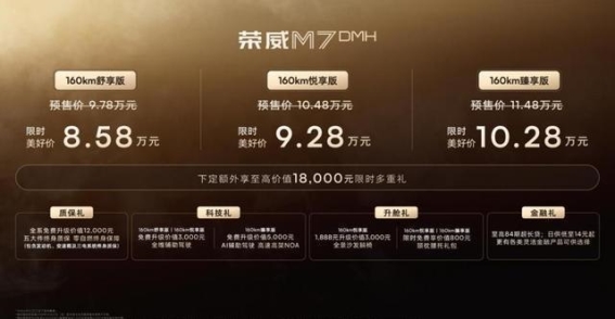 2025年9月17日,荣威M7 DMH正式上市。作为一款中大型插电混动轿车,荣威M7 DMH的定价无疑是这个市场的一个突破。官方指导价为9.78万元至11.48万元,涵盖了160km舒享版、160km悦享版和160km臻享版三种配置。真正吸引人的是限时优惠活动,消费者在10月31日前下订并锁定订单,可以以8.58万元至10.28万元的优惠价格购买这款车,意味着只需不到9万元,便能拥有一台中大型插混轿车,这一价格无疑拉低了这一细分市场的门槛。