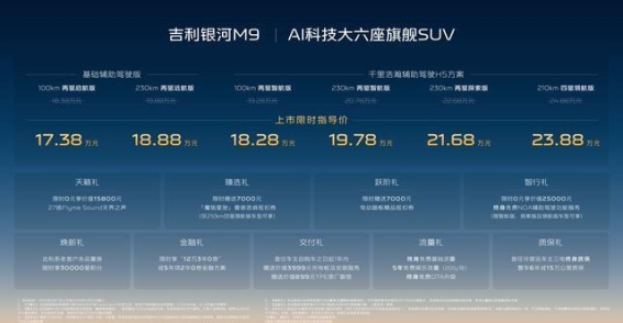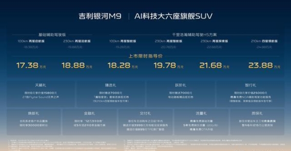 吉利银河M9共推出6款配置车型,覆盖四驱与两驱两大驱动形式,价格区间为17.38万元至23.88万元。此款车型还为用户提供了多项限时优惠,如赠送价值15800元的音响系统、7000元电动踏板抵扣券、以及价值25000元的终身免费NOA辅助驾驶等福利,进一步提升了消费者的购车体验。